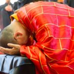 When entering the shrine room, a Buddhist practitioner may do three prostrations facing the statue, or make a short bow with hands folded. This is done as a symbol of the surrender of oneself and the desire to benefit all beings.
