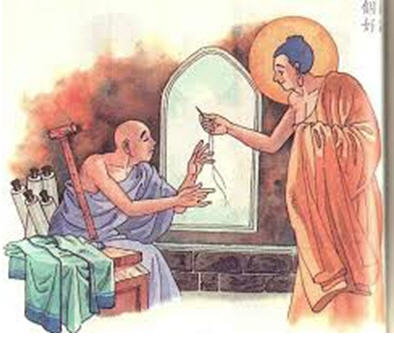 “It was the Buddha who threaded the needle for you.” The Buddha answered while mending the torn hole. “是佛陀為你穿針。”佛陀一面回答,一面為他縫補破洞。